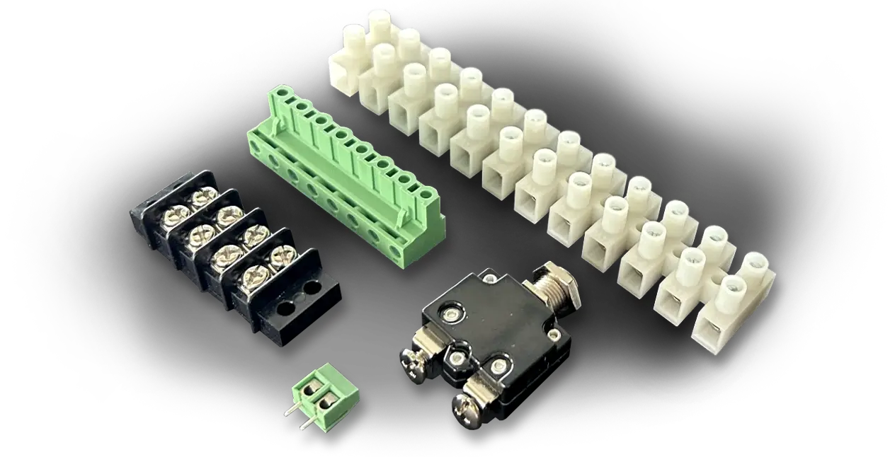 Electromechanical switching and connection components including relays for circuit control and terminal blocks for organized wiring distribution.