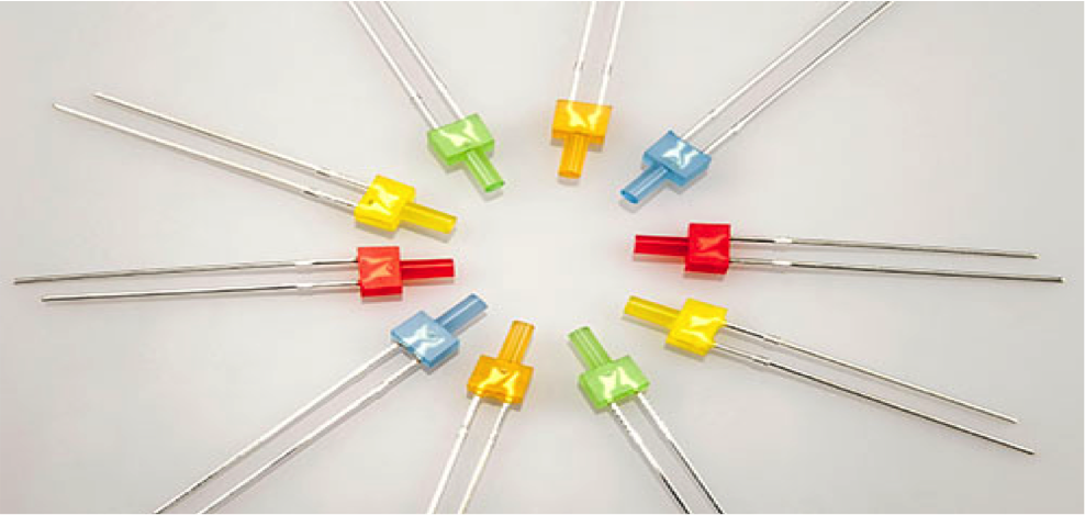 Through-hole Tower LEDs are offered in a variety of packages such as 1.8mm Round, 2mm Flat Top, 2.4mm Flat Top, with integrated built-in resistor or low current options, and color choices include green, red, yellow, white, blue and orange.