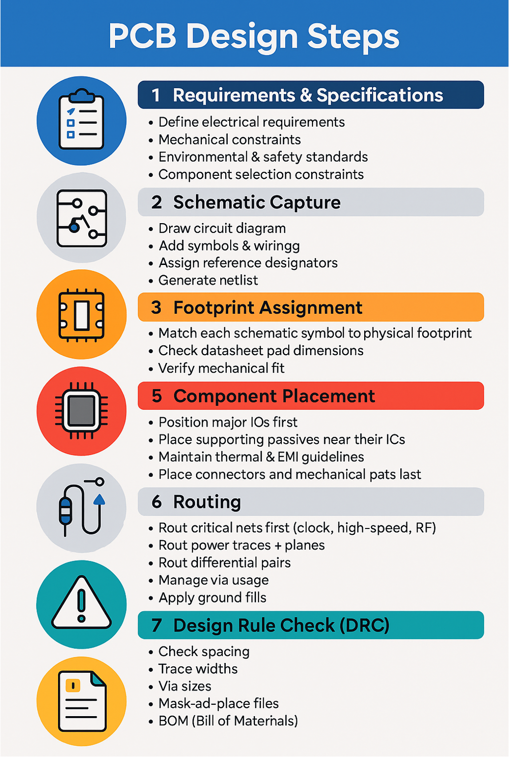 - Draw the circuit diagram in design software (e.g., KiCad, Altium, Eagle, OrCAD)