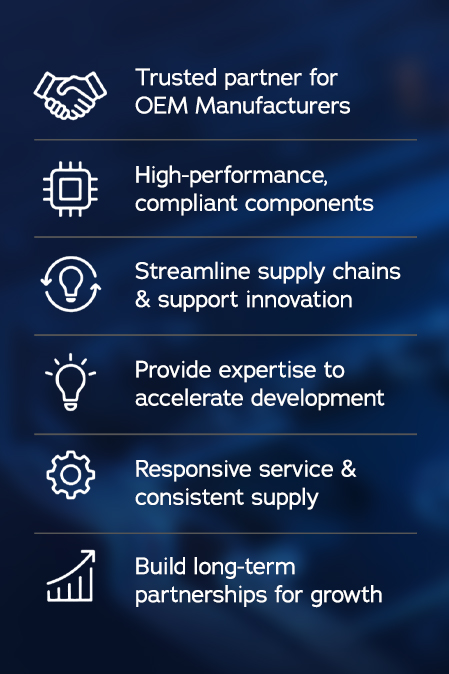 “Our mission is to be the trusted partner for OEM manufacturers by delivering high-performance electrical and electronic components that meet the highest standards of quality, reliability, and compliance. We aim to streamline supply chains, support product innovation, and provide technical expertise that empowers our clients to accelerate development cycles and enhance the value of their end products. Through responsive service, consistent supply, and a deep understanding of OEM needs, we strive to build long-term partnerships that drive mutual growth.”